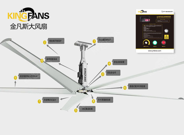 安全技術:金凡斯特有十重安全保障,多項專利技術,保證工業(yè)大風扇的安全運行,風扇整體、各部件不會發(fā)生松動、斷裂或墜落,從根本上保護用戶使用安全。
